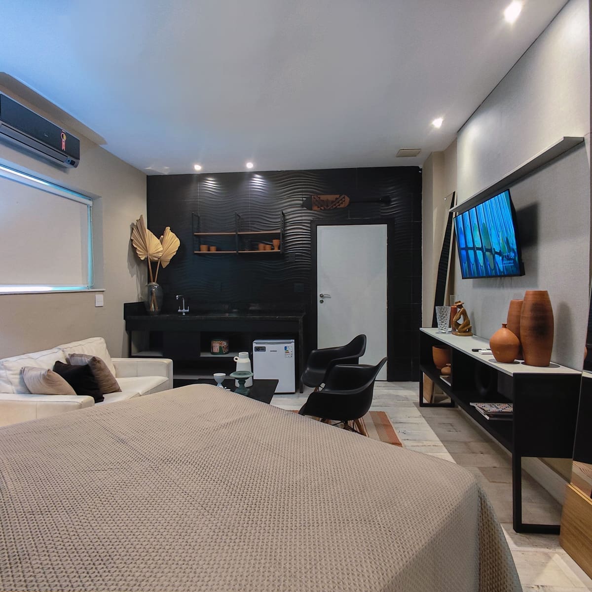 The Samba Suite is one of two boutique hotel suites in Rio de Janeiro located on our exclusive fourth‑floor pool deck, offering striking views of the Bay of Guanabara and the Rio skyline. This 330‑square‑foot (30 m²) suite features a queen‑size bed, a dramatic vaulted ceiling, and a bright, contemporary layout that feels both spacious and refined. Guests enjoy immediate access to the pool deck, open daily from 9:00 AM to 9:00 PM.